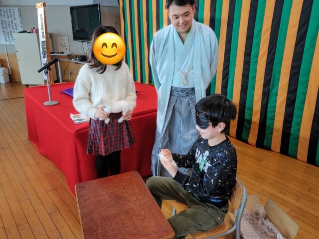 一方、「寿限無」は、すでに授業で扱われていた演目ということもあり、学校側からのリクエストを受けて上演し、「学び」と「芸能」がつながる体験を意識した構成としました。