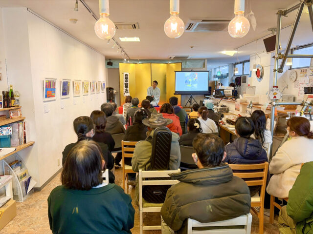 現在制作中の作品をスクリーンに映しながら、初めてお客様の前で披露しました。
